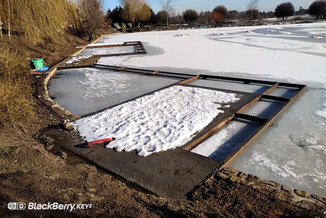 Zpevnění hráze, kovová konstrukce domků a propojovacího mola, tesařské práce, vnitřní rozvody, vybavení.